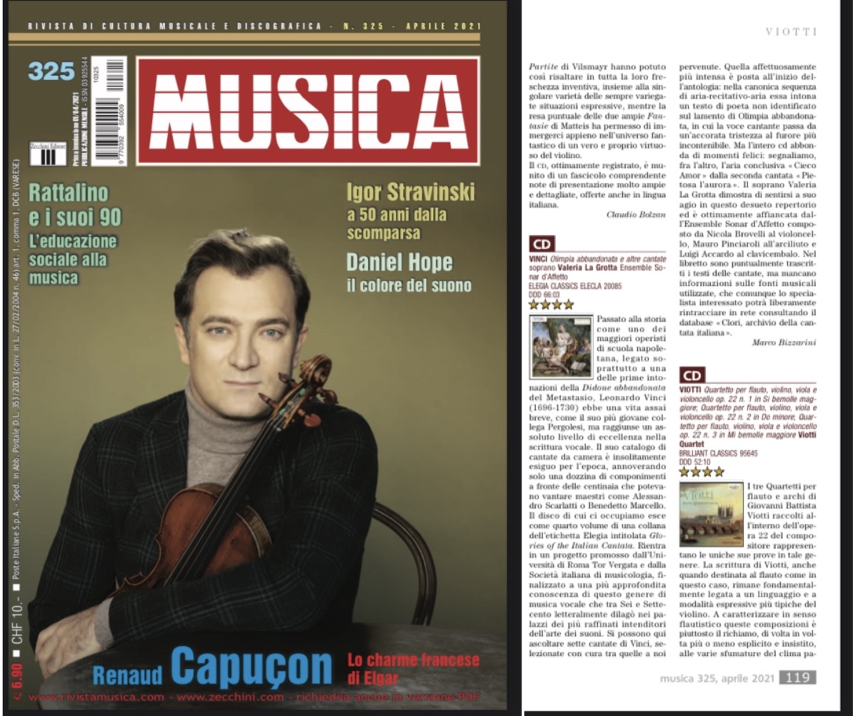 “L’enregistrement des cantates plus rares mais guère moins conventionnelles de Leonardo Vinci (1696 – 1730) convainc mieux, grâce à Valeria La Grotta, soprano lumineuse et délicate, mais grâce aussi réalisations inventives du continuo élarg, avec archliuth, clavecin et violoncelle de Sonar d’Affetto (Elegia, ****).”